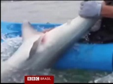Uma viagem de pescaria de dois amigos ganhou contornos dramáticos quando um deles fisgou um tubarão e lutou com o animal dentro da água, segurando-o pelo rabo.